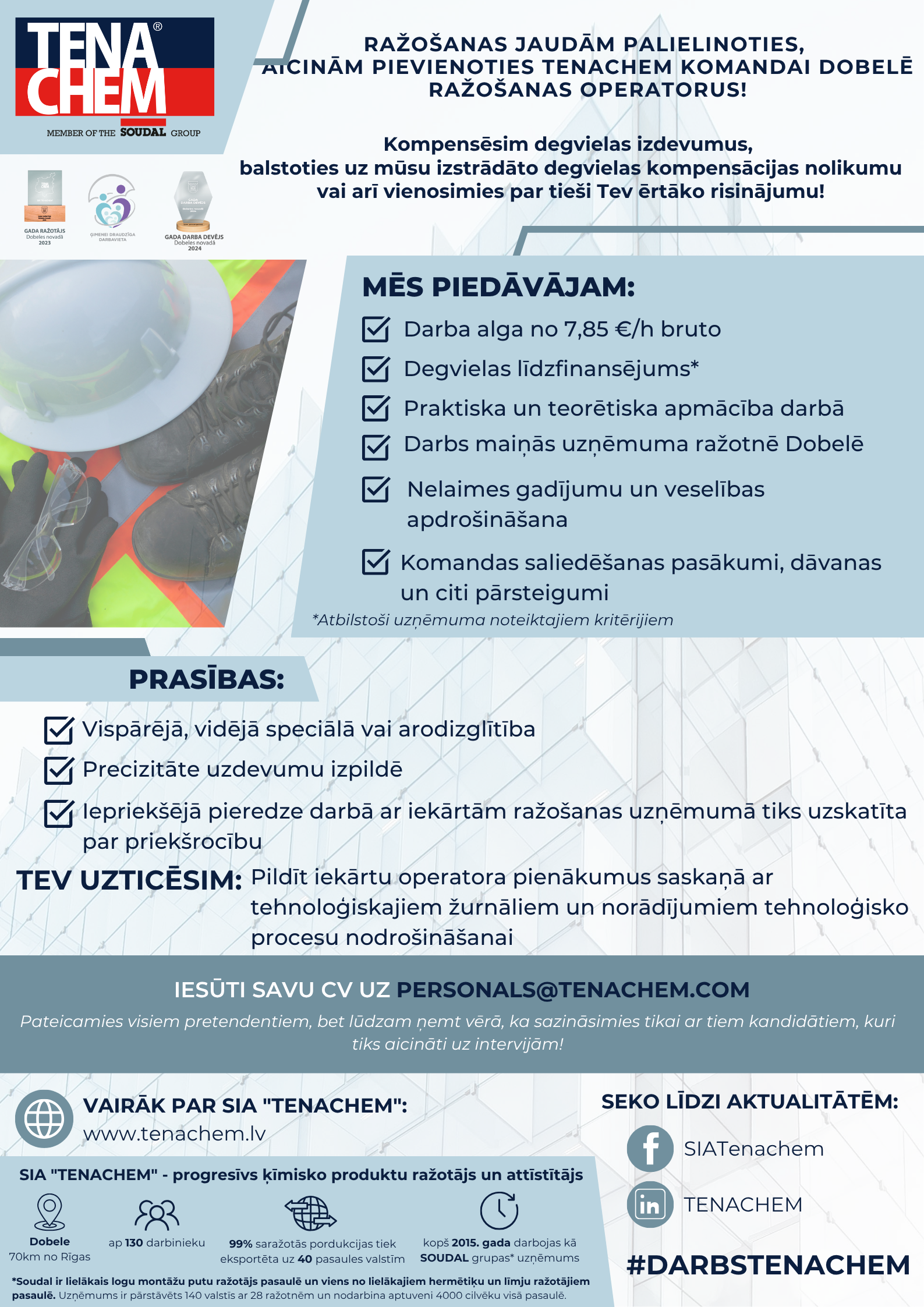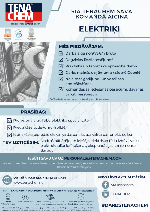 Ja esat talantīgs, ambiciozs, kreatīvs, kā arī darbu mūsu kompānijā redzat kā iespēju savai profesionālajai izaugsmei, sūtiet savu CV un motivācijas vēstuli uz e – pastu personals@tenachem.com – ar prieku to izskatīsim!